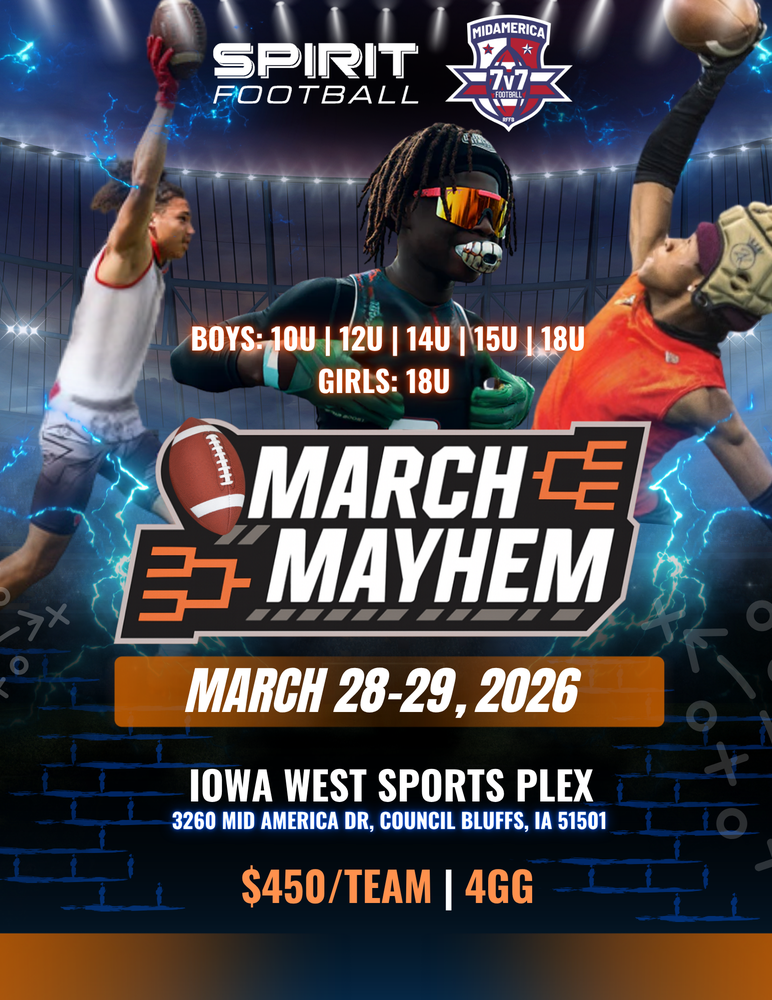 March Mayhem will take place on March 28 and 29, 2026. This is an indoor 7v7 event at the Iowa West Sports Complex in Council Bluffs, IA. Teams are guaranteed four games filled with intensity, competition, and excitement.