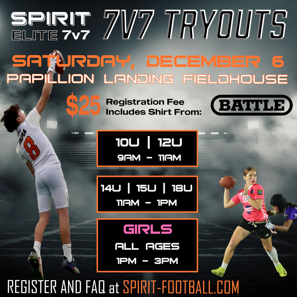 Spirit Elite 7v7 is back and ready for another exciting season of competitive football and player development! Tryouts for the 2026 season will be held on Saturday, December 6, with opportunities for athletes in multiple age divisions.
